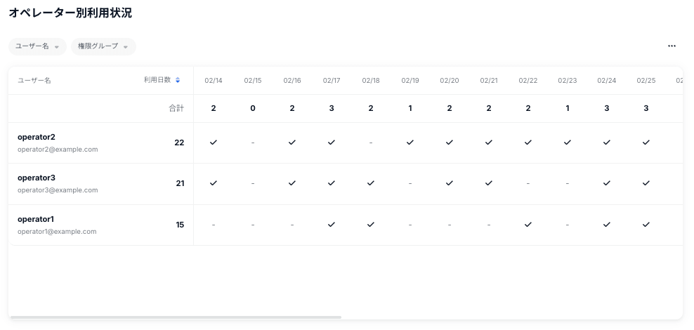 日別または月別で、管理画面にログインしたかどうかをオペレーター別に確認できます。