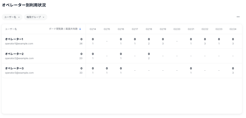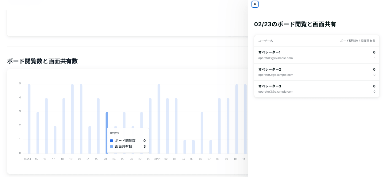 日別または月別で、コネクトボード閲覧数と画面共有数をオペレーター別に確認できます。