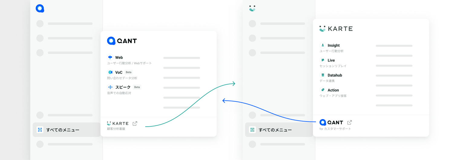 KARTEとQANTそれぞれのナビゲーションメニューの「すべてのメニュー」の導線から相互にアクセスすることが可能です。