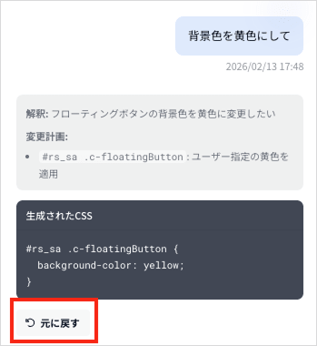 - チャットでデザインイメージを指示すると、それに合わせたカスタムCSSが生成され、編集しているサポートアクションに適用されます。