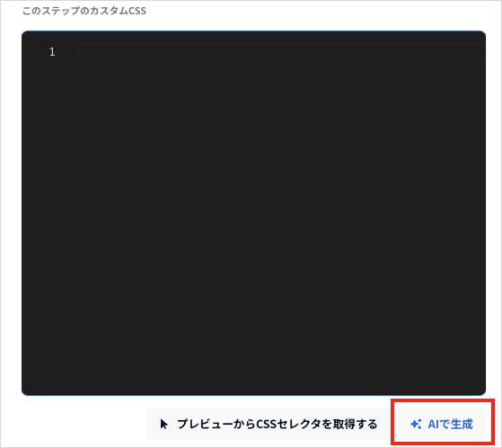 - サポートアクション編集画面のカスタムCSSエディタの下に「AIで生成」ボタンをクリックするとカスタムCSS生成モードでQWAIASが起動します。